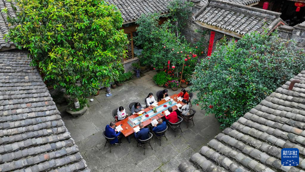 4月14日,四川省阆中市,“有声阅读”读书会的阅友在阆中古城土生金客栈诵读经典(无人机照片)。新华社发(王玉贵 摄)